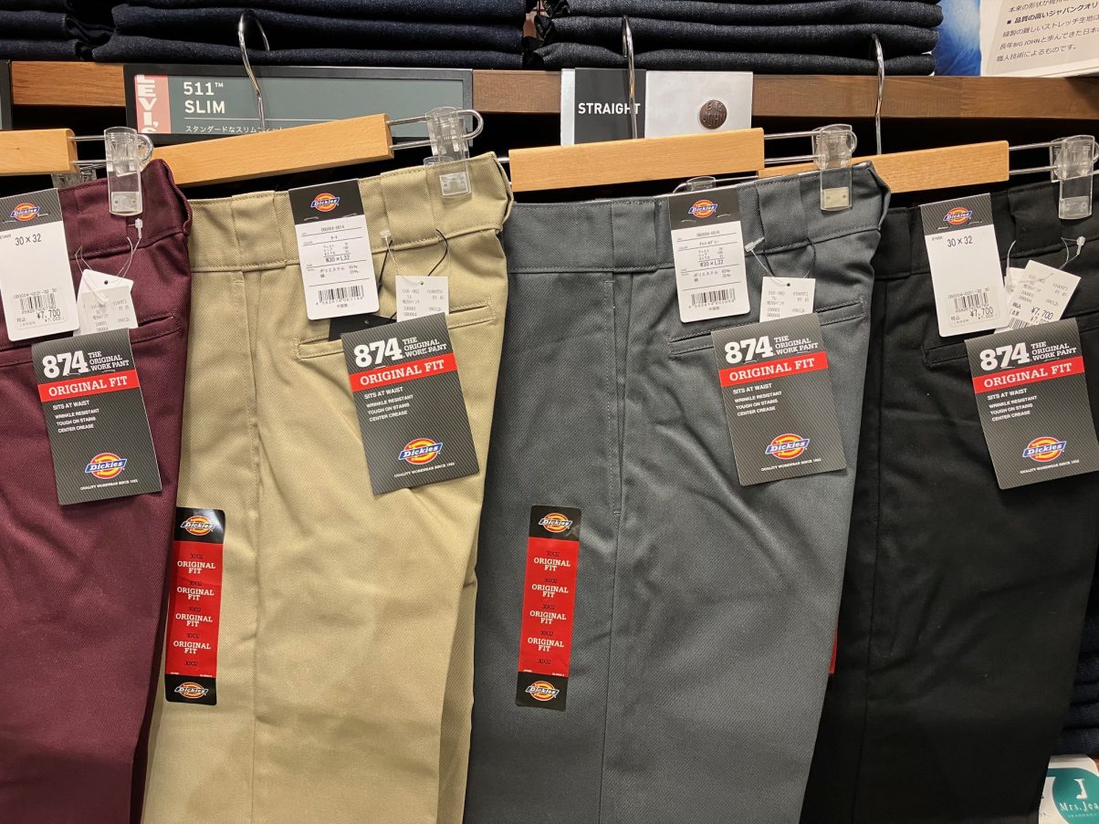 昨今のアメカジ人気の影響で確実に若いお客様も増えており、特にディッキーズの874は若いお客様にもよくご購入いただきております。